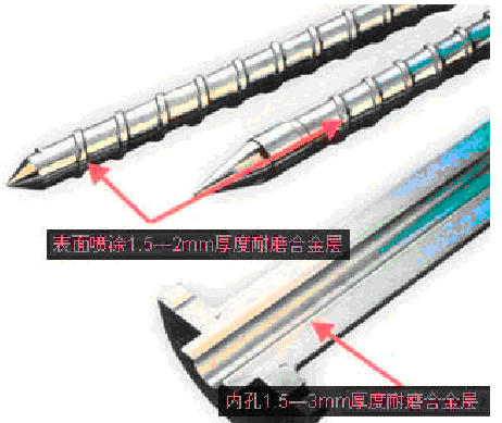 雙金屬螺桿又叫雙合金螺桿,是注塑機(jī)上專用的,是在普通螺桿表面電鍍一層合金,合金用于增強(qiáng),提高耐腐蝕、耐磨損性能,適用于添加了玻纖、石粉等的塑料成型。
