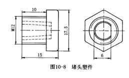 塑件工藝性分析? ??圖10-8所示堵頭零件,材料為玻璃纖維增強尼龍66(GFR—PA66),帶有M12的外螺紋。由于材料強度高和要求一模多腔,不宜采用強制脫螺紋或哈夫分型脫螺紋,加之塑件的錐形沉孔有一平面,可用于旋轉脫螺紋時塑件止轉,所以該件適合采用旋轉方式脫螺紋。