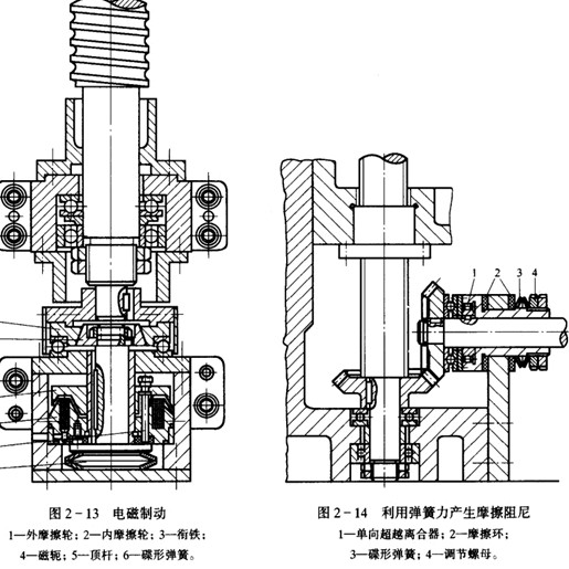 由于滾珠絲杠副無自鎖作用,特別對垂直安裝的滾珠絲杠副,必須安裝制動裝置。圖2—13是利用電磁制動器制動的。圖2—14是利用單向超越離合器防止絲杠逆轉的制動裝置。