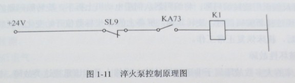 例如,一臺(tái)采用SIEMENS 810M系統(tǒng)的數(shù)控淬火機(jī)床,一次機(jī)床開(kāi)機(jī)后,啟動(dòng)淬火液泵時(shí),泵啟動(dòng)不了,但沒(méi)有報(bào)苦信息.分析機(jī)床的工作原理,淬火泵的控制原理如圖1-11所示,淬火液泵是受接觸器KI控制的,SL9是淬火液液位開(kāi)關(guān),液面沒(méi)有問(wèn)題。而KA73是受PLC輸出Q7.3控制的。